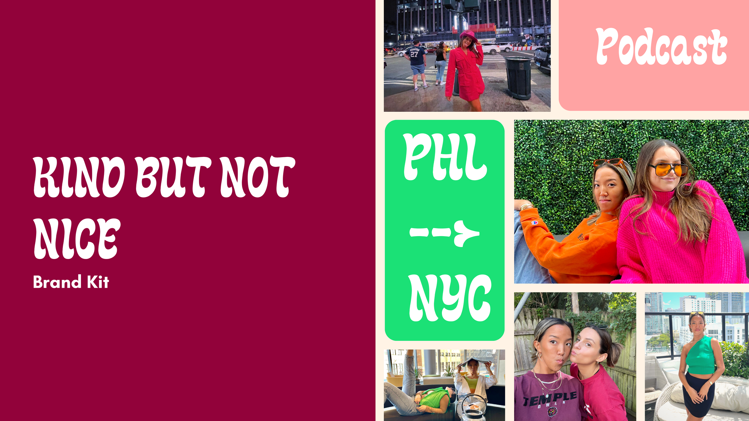 After graduation we took time off as we settled into full time jobs and a new chapter of our lives. During that time off we wanted to rebrand to create a podcast that better aligned with the lives we were living. I pitched the idea Kind But Not Nice. This section will break down the creation, reasoning and examples of the rebrands execution. Kind But Not Nice has since ended as of September 2023. As of January 2024 I started a solo podcast What’s All That Yappin’?