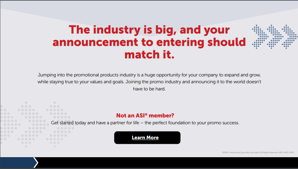 Joining the promo industry via Advertising Specialty Institute (ASI) as a supplier member.